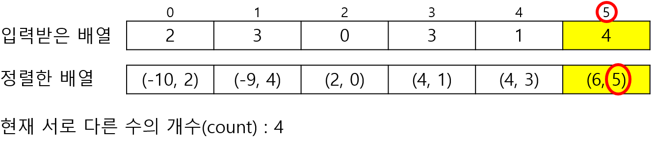첫번째 칸은 당연히 자신보다 작은 서로 다른 수가 없기 때문에, 바로 첫번째 칸에 들어있는 index에 접근하여 현재 서로 다른 수의 개수를 넣어주자.