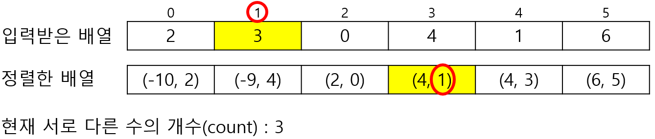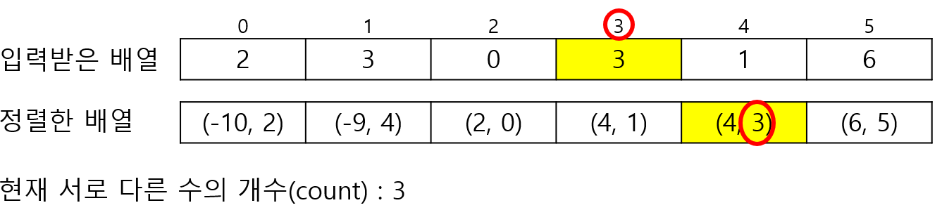 num[ordered[i].index] = cnt; // 저장된 인덱스에 접근해서 서로 다른 수의 개수 저장