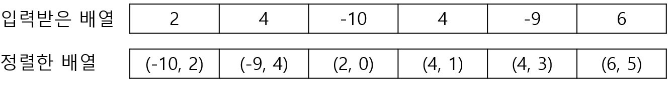 정렬할 배열의 구성을 좀 바꿔주자. 입력받은 수만 저장하지말고 ( 입력받은 수, index ) 같이 저장하자.