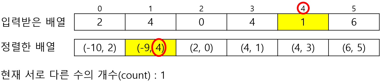 자, 서로 다른 수의 개수를 저장할 변수(count) 하나를 갖고 정렬한 배열을 처음부터 끝까지 쭈우욱 돌아보자.